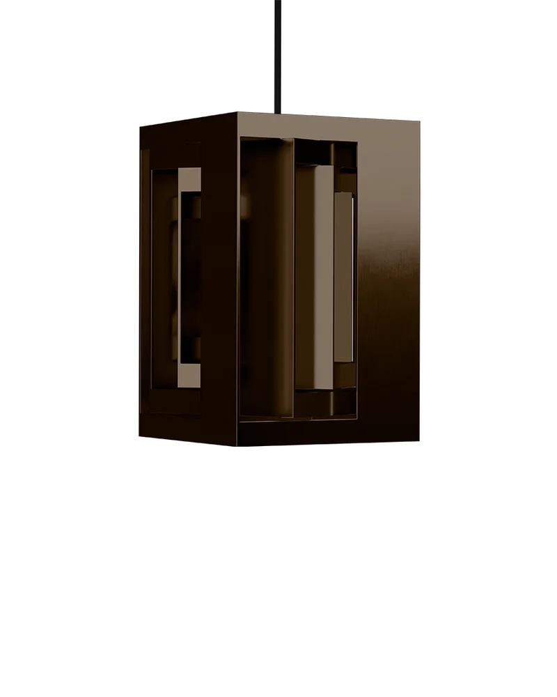 Lampans design består av fyra kubiska moduler i bronsanodiserad aluminium, var och en med exakt utskurna rektangulära öppningar. När pendeln tänds skapar de geometriska formerna ett levande spel av ljus och skugga. Ljuset sprids mjukt och indirekt, vilket ger varma glimtar och stämningsfulla reflektioner på omgivande ytor utan bländning perfekt över matbordet, i vardagsrummet eller som ett markant statement i rummet.