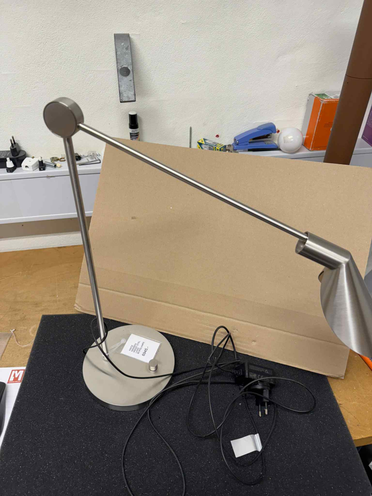 Lampan är en utställningsmodell - men fungerar felfritt. Det saknas en stång i lampan där dess vippfunktion sitter. Detta påverkar dock inte lampans funktion, utan endast dess designmässiga betydelse.