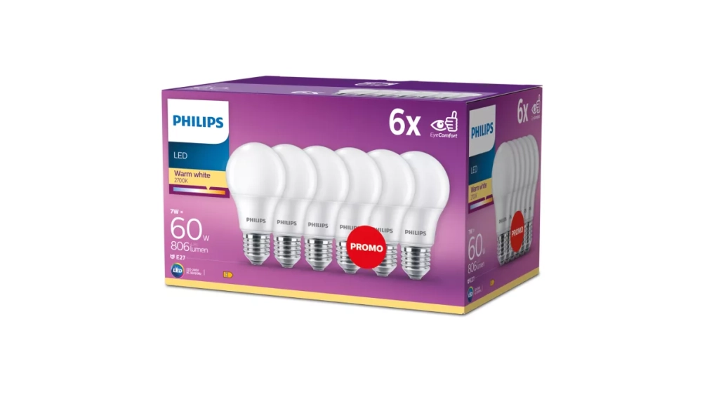 Denna energieffektiva Philips LED-lampa med E27-sockel är ett modernt och hållbart alternativ till traditionella 60-watts glödlampor. Med en låg strömförbrukning på endast 7 watt ger lampan ett behagligt, varmvitt ljus (2700K), vilket skapar en mysig och inbjudande atmosfär i hemmet - perfekt för både vardagsrum, kök och sovrum.