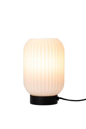 Serien Fluted Opal glas från danska Dyberg Larsen består av två bordslampor, en golvlampa och 2 storlekar av pendlar. Denna bordslampa är den lägsta i serien med en höjd på 23 cm.