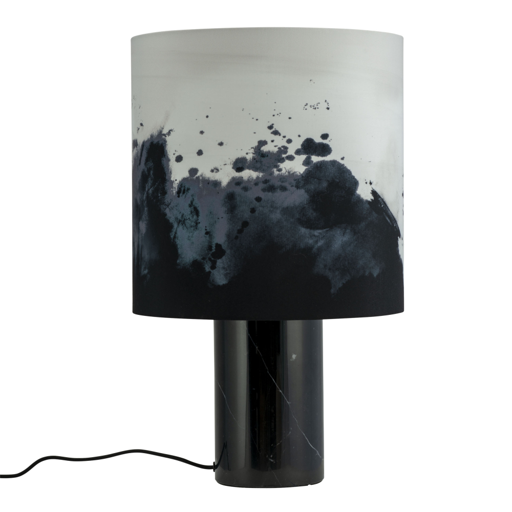 Skärmen är målad med färgfläckar och konstverket är öppet för tolkning! Är det en våg, ett satellitfoto av ett månlandskap eller en trädtopp? Konstverket hålls uppe av en massiv kropp i marmor, vilket ger tyngd åt lampan både bokstavligt och bildligt.