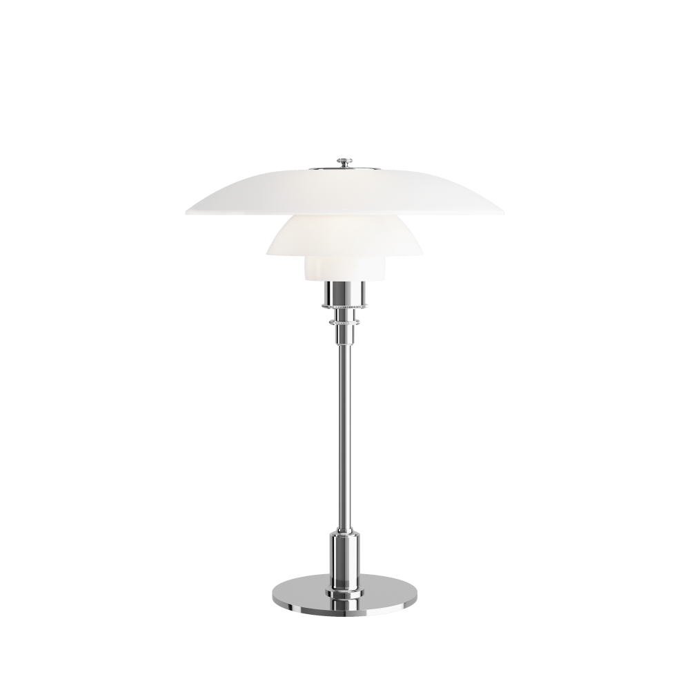 Denna PH 3½-2½ Bordslampa är designad av Poul Henningsen, en pionjär inom belysning. Lampans skärmar är gjorda av munblåst, vitt opalglas och har ett lamphus och stativ i högblank kromad mässing. Med en diameter på 330 mm och en höjd på 450 mm passar denna lampa perfekt på vilket bord som helst. Du kan använda en maximal ljuskälla på 60W E14 för denna lampa, och den levereras med en sladdlängd på 2,5 meter.
