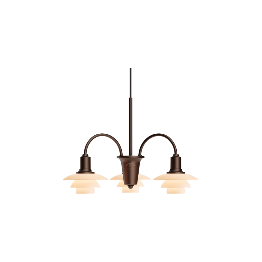 Ursprungligen kallad "Bombardementskronen", var en del av Louis Poulsen-katalogen från 1933 till mitten av 1960-talet och är baserad på den ikoniska principen om det reflekterande System PH, som utvecklades av Poul Henningsen 1926. Poul Henningsen utvecklade konceptet för denna ljuskrona, så att den kunde produceras i olika versioner med olika antal böjda armar, var och en med ett PH 1/1 glasskärmset, anslutet till en central kärna. Kärnorna staplas vertikalt, så att det finns utrymme för att alla skärmar exponeras harmoniskt. PH 1/1 Ljuskrona Centenary Edition finns med 3, 6 och 9 armar och levereras med en brunerad mässingsfinish med hårfina linjer. Varje treskärmset består av munblåst, dusty terracotta-färgat opalglas, som avger ett mjukt, diffust och bländfritt ljus. En skulptural design med historiskt djup, som verkligen sticker ut genom att tillföra ett element av vintage till moderna interiörer. Ljuskronorna finns i ett begränsat antal, 200 st. av de 9-armade, 400 st. av de 6-armade och 1000 st. av de 3-armade. Varje ljuskrona är noggrant ingraverad med ett unikt nummer i guld, vilket gör den till ett äkta samlarobjekt, som kan gå i arv genom generationer.