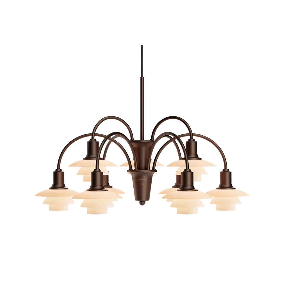 Ursprungligen kallad "Bombardementskronen", var en del av Louis Poulsen-katalogen från 1933 till mitten av 1960-talet och är baserad på den ikoniska principen om det reflekterande System PH, som utvecklades av Poul Henningsen 1926. Poul Henningsen utvecklade konceptet för denna ljuskrona så att den kunde produceras i olika versioner med olika antal böjda armar, var och en med ett PH 1/1 glasskärmset, anslutet till en central kärna. Kärnorna staplas vertikalt, så att det finns plats för att alla skärmar exponeras harmoniskt. PH 1/1 Ljuskrona Centenary Edition finns med 3, 6 och 9 armar och levereras med en brunerad mässingsfinish med hårfina linjer. Varje treskärmset består av munblåst, dusty terracotta-färgat opalglas, som avger ett mjukt, diffust och bländfritt ljus. En skulptural design med historiskt djup, som verkligen sticker ut genom att tillföra ett element av vintage till moderna interiörer. Ljuskronorna finns i ett begränsat antal, 200 st. av de 9-armade, 400 st. av de 6-armade och 1000 st. av de 3-armade. Varje ljuskrona är noggrant ingraverad med ett unikt nummer i guld, vilket gör den till ett äkta samlarobjekt, som kan gå i arv genom generationer.