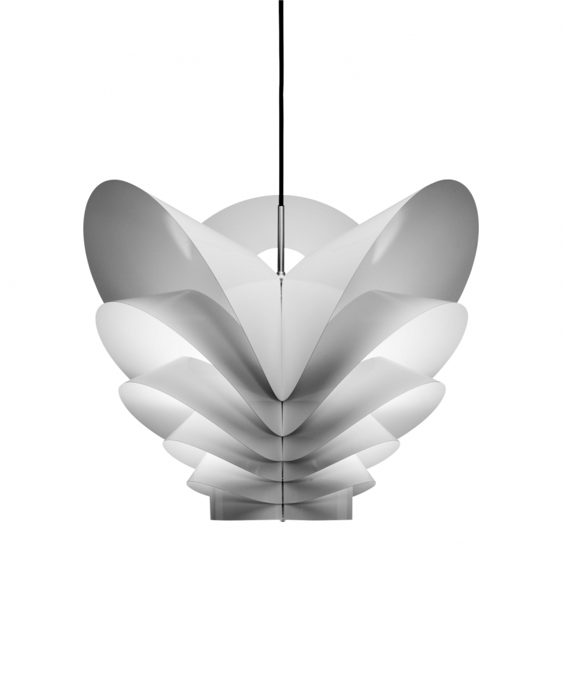 De vitlackerade aluminiumskärmarna, som är matta på insidan och halvblanka på utsidan, är monterade på extruderade aluminiumrör i superelliptisk form. Själva ljuskällan är perfekt avskärmad av en lätt frostad glascylinder. Det gör att lampan kommer att ge vackert ljus, oavsett om du installerar ett energibesparande kompaktlysrör i lampan eller en briljant halogenljuskälla.