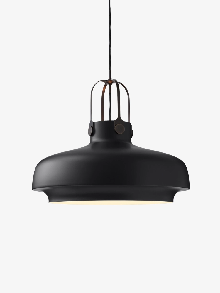 Copenhagen Pendel SC8 Matt Black/Bronzed Brass designades med solid inspiration från det maritima, då gaslampor från huvudstadens hamnanläggningar starkt influerade formen. Själva grundformen moderniserades i processen men den lackerade metallskärmen, som spänns fast på sladden med utspänd böjd metall, osar av den historiska bakgrunden.