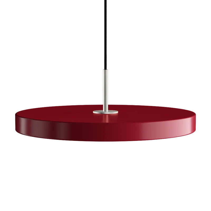 Asteria Plus från UMAGE är en modern pendellampa där funktion och estetik går hand i hand. Den smala skärmen i rubinröd ger värme och karaktär till interiören, medan den integrerade LED-lampan ger ett behagligt och naturligt ljus med hög färgåtergivning.