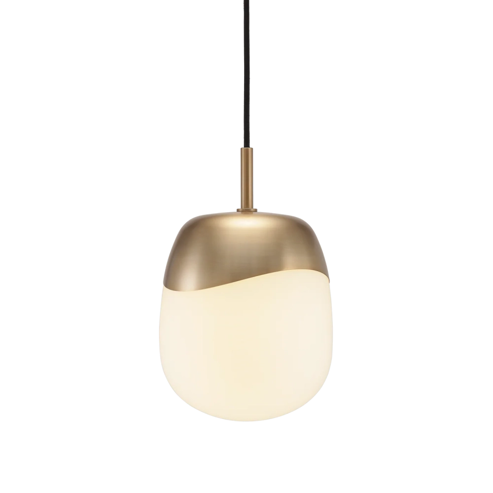Spring Pendant kombinerar skulptural kontrast med mjuk belysning i en modern och raffinerad design. Den munblåsta opalglasskärmen sprider ett varmt, stämningsfullt ljus, medan den asymmetriska mässingstoppen tillför ett markant och överraskande designelement.