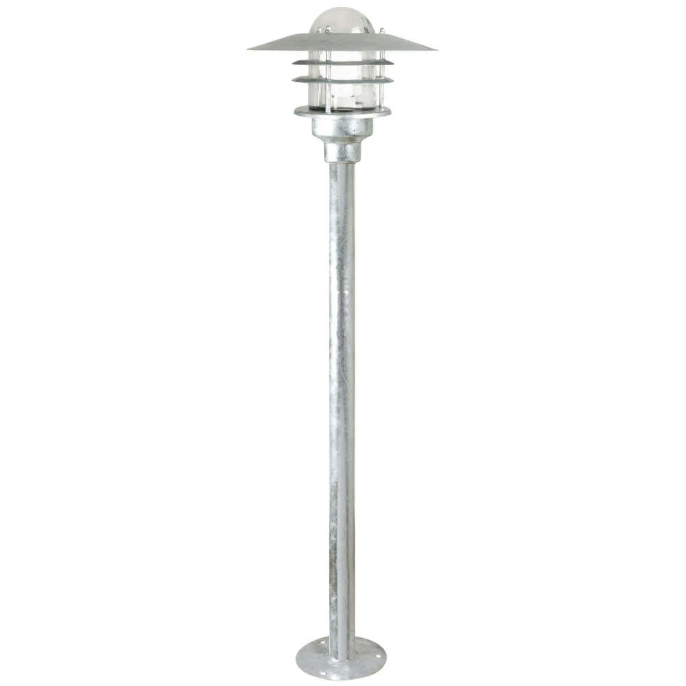 Den galvaniserade ytan gör lampan motståndskraftig i det nordiska klimatet. Vi rekommenderar lampor i galvaniserat stål för kustnära områden. Köp eventuellt till basen för nedgrävning, som passar till denna produkt.