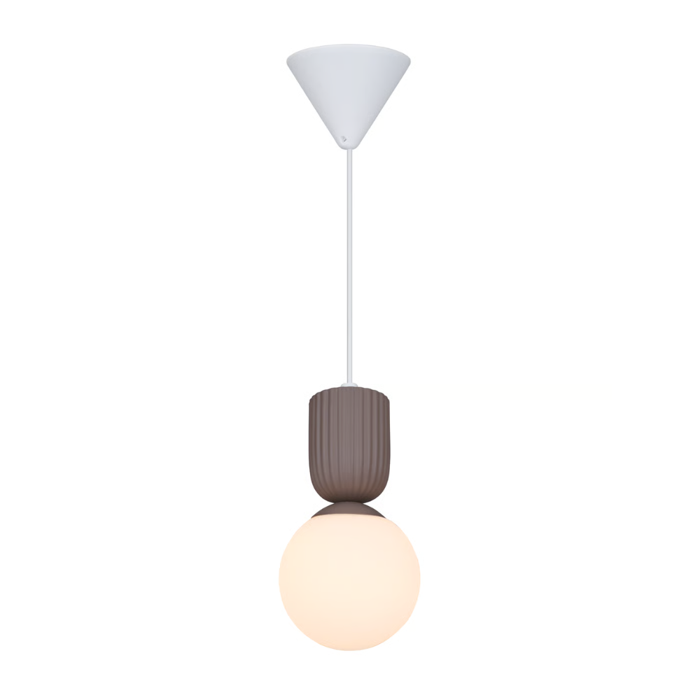 Sadie-pendeln kombinerar en krusig opalglasskärm med en rund keramiksockel i ljusbrunt. Den mjuka formen och den munblåsta glasstrukturen skapar en organisk och tidlös estetik som ger rummet karaktär och värme.