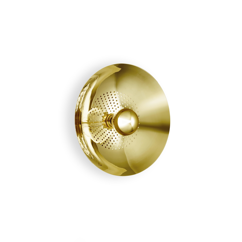 Wanted Vägglampa från Design By Us är en lampa som fångar ögat med sina mjuka gyllene former och förföriska uttryck. Den perforerade metallskärmen låter ljuset strömma ut i ett varmt och elegant mönster, som skapar en stämningsfull atmosfär och en känsla av lyx i rummet.
